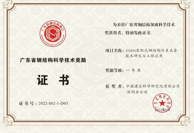 GSIN 裝配式鋼結構建筑成套技術的應用是建造方式的重大變革,是推進新型建筑工業化發展的重要舉措,有利于節約資源能源、減少施工污染,有利于促進建筑業與信息化、工業化深度融合,是推進建筑業綠色發展、提高建筑質量和安全性的重大舉措。項目科研成果獲2022年度廣東省鋼結構協會科技進步一等獎。