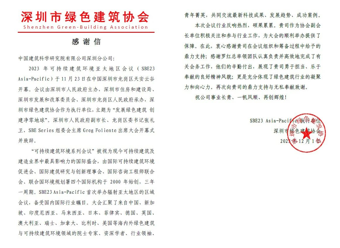 近期,深圳市綠色建筑協(xié)會向中國建研院深圳分公司發(fā)來感謝信,對中國建研院深圳分公司支持保障2023年可持續(xù)建筑環(huán)境亞太地區(qū)會議順利舉辦表示感謝。