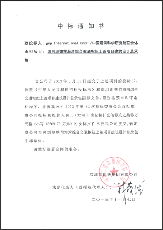 近日,我院與德國GMP國際建筑設計公司組成的設計聯合體收到了深圳市地鐵集團有限公司發來的關于深圳地鐵前海灣綜合交通樞紐上蓋項目建筑設計總承包的中標通知書。